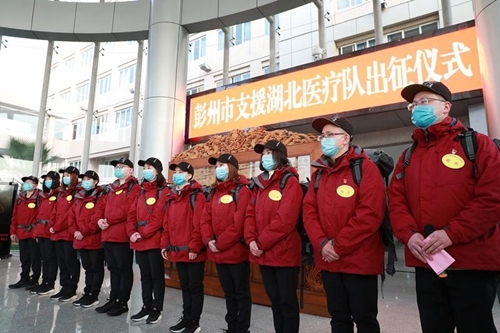 2月21日上午,我市第一批支援湖北医疗队11名医务人员在彭州市行政中心集结出征。市委书记、市长王锋君,市委副书记张雄正,市委常委、统战部部长晏渃海,市政府副市长徐苒鑫,市卫健局领导班子为他们壮行。队员代表表态:“誓与疫情抗争到底,坚决打赢抗疫阻击战,不辜负祖国和人民的重托!岂曰无衣,与子同袍,与子同泽,与子同裳!”