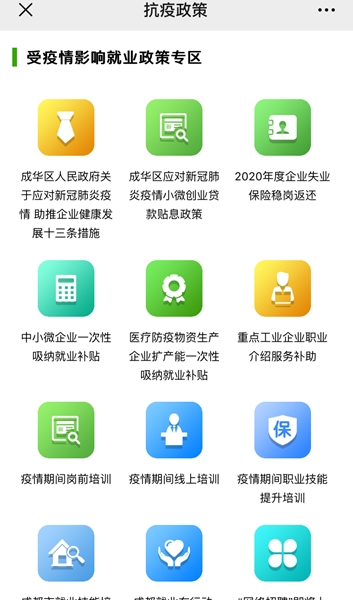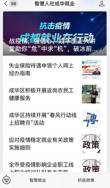 四川在线消息(记者 钟帆)网络招聘、创贷贴息、技培补贴、政策解读……继昨天成华区公布应对疫情,助推企业健康发展13条措施后,2月21日,一个集各级就业创业信息等多功能一体的“抗疫政策”在线服务专栏正式上线。据介绍,这是成都市成华区打好服务辖区企业复工复产“组合拳”,帮助企业解难纾困的又一举措。“该区内各参保企业和个人只要登录‘智慧人社成华就业’微信公众号首页,点击‘抗疫政策’便可一键直达访问。”该区人社局相关负责人表示。