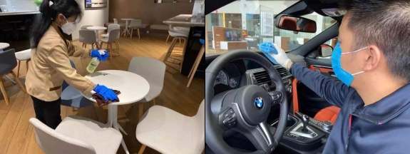 宝马全国的经销商伙伴也加入了安全复工的行列。宝马推出“宝马经销商展厅公众健康防护指南”,针对展厅店内环境卫生及消毒管理制定了10类措施,涵盖从展厅通风换气,到洗手间的清洁消毒和垃圾处理等各个环节。此外,在保障工作人健康,保证车辆(特别是试驾车辆)卫生安全方面提出了明确要求。进店客户与员工均需佩戴口罩、测量体温、保持一米沟通距离等也成为有效的防护措施。