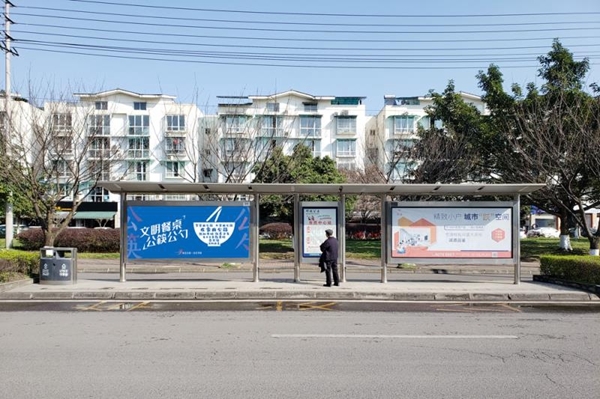 公交市民中心站的站台广告位上,一幅宽屏、蓝底白字、简约明朗的“文明餐桌·公筷公勺”公益广告画,时刻提醒着市民“聚餐用公筷,共餐用公筷,在家用公筷。”