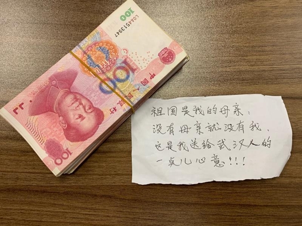 “我们还没来得及问及姓名,甚至连人脸都没看清,他(她)便放下钱和纸条就走了。”该派出所值勤民警说,当时这名爱心人士放下一笔1万元捐款和纸条后,便匆匆离去,“他的善举让我们在场的人员非常感动,他留下的不仅是一笔抗击疫情的爱心捐赠,也是对武汉同胞的深切关心,更是一份对祖国的大爱。”