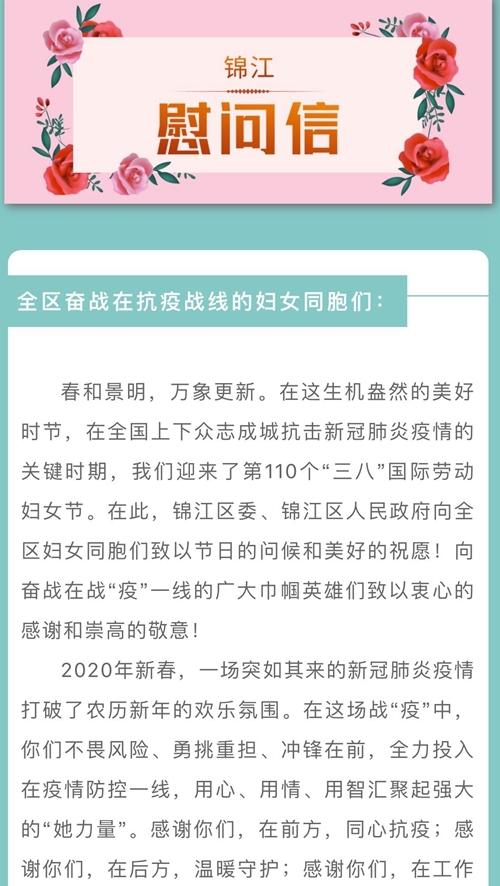 春花绽放,万象更新。在这生机盎然的美好时节,在“三八”国际劳动妇女节之际,为了向奋战在战“疫”一线的广大巾帼英雄们致以衷心的感谢和崇高的敬意,成都市锦江区委、锦江区人民政府向全区妇女同胞们发出了慰问信,致以节日的问候和美好的祝愿!