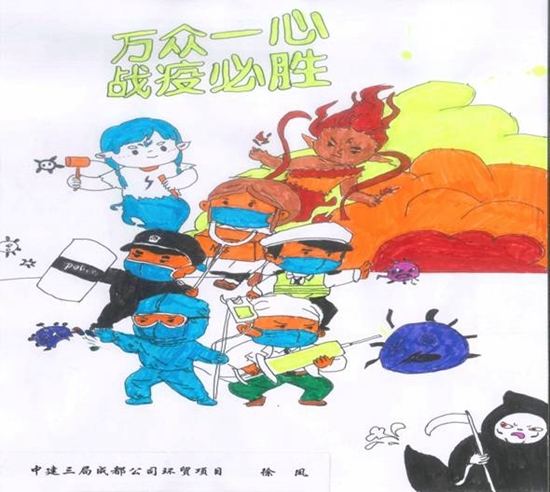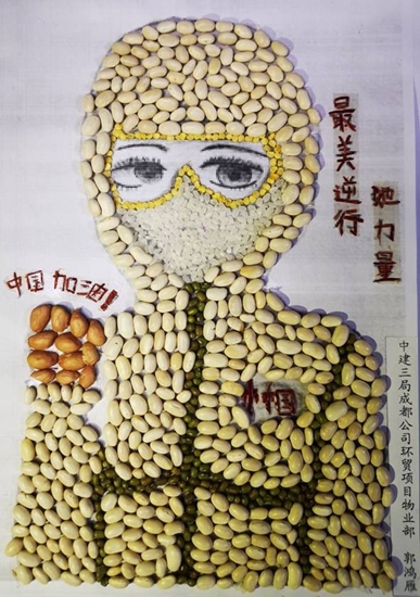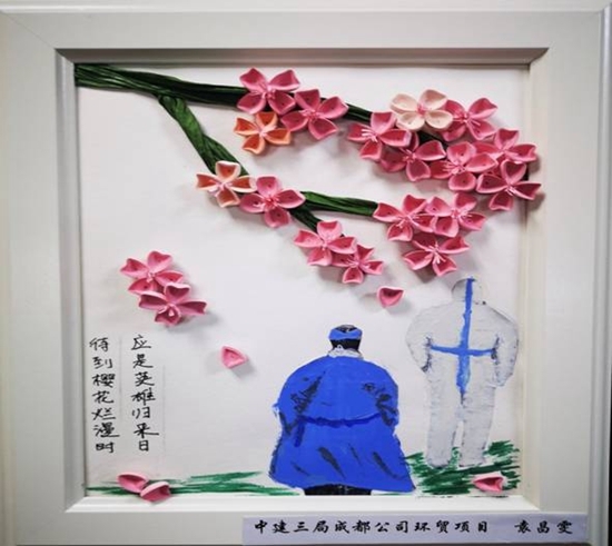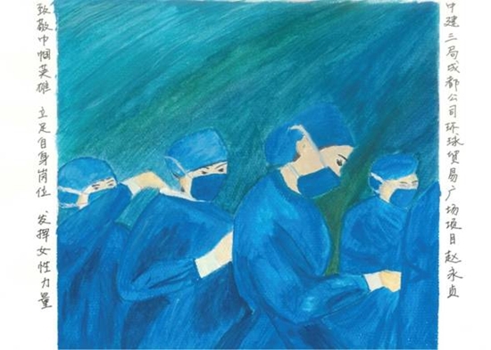 赵永贞是中建三局成都环贸项目的一名建设者。她说,突如其来的疫情让人避之不及,而自己的同事要么“逆行”奋战在“两山”医院建设和维保的前线,要么在武汉的方舱医院里开展志愿服务,自己身在成都也别无它长,索性拿起很久不动的彩笔,只为着那些白衣天使们记录动人的瞬间。为此,她在自己的作品上写下“致敬巾帼英雄,立足自身岗位,发挥女性力量”的倡议。