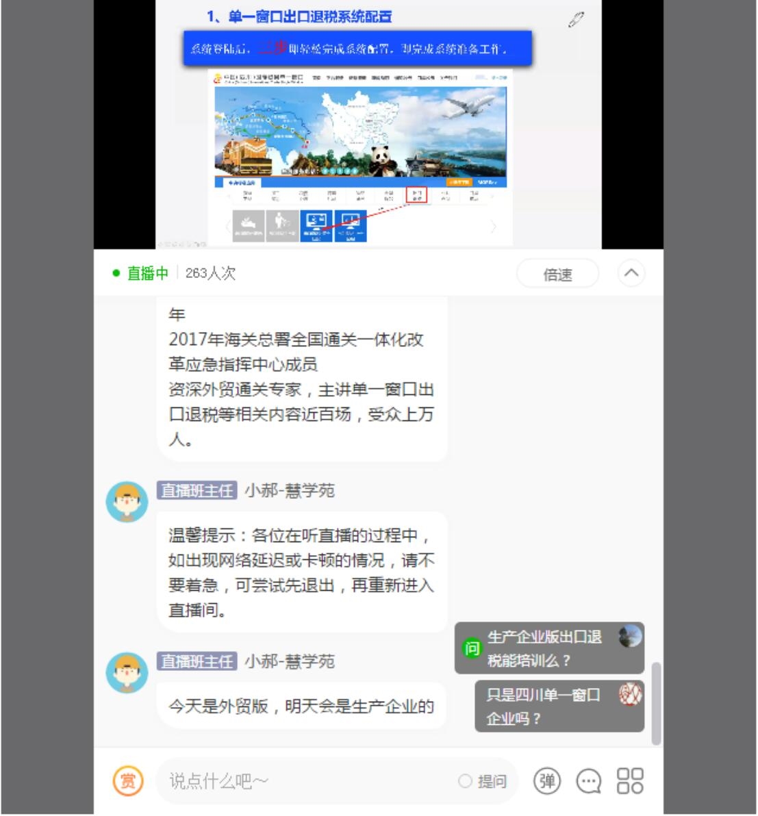 目前,四川“单一窗口”正不断上线新功能。原来计划定期开展培训,但受疫情影响培训暂时无法举行,因此四川“单一窗口”运维单位四川省物流信息服务有限公司与中国电子口岸数据中心成都分中心联合推出了“网课”,主动服务跨境贸易企业,拥有215家企业的862名代表在线听课。