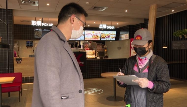 3月11日上午10点,在位于邛崃市瑞云欣广场的肯德基店门外,顾客正在领取从网上下单的商品。整个店面也将桌椅缩减一半,并在桌与桌之间保持一定间距,接待顾客堂食。据了解,除茶楼、电影院、KTV等特殊经营场所外,邛崃市瑞云欣广场目前已有65户商家恢复营业。