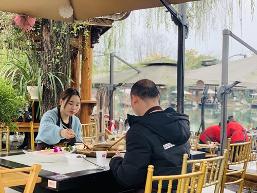 “尊敬的顾客,你们好,在用餐之前,我给你们介绍一下玛歌庄园使用公筷公勺倡议。第一双筷子是锅里涮烫使用,然后第二双筷子是直接入口使用,多一份公筷,多一份健康,谢谢你们。”在新都区天府沸腾小镇里的玛歌庄园火锅,店员们在上菜服务前,都会将两双不一样的筷子放在客人面前,同时为客人们讲解两双筷子的不同用法。