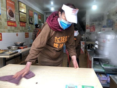拖地、抹桌、消毒……送走又一批客人后,沈包子早餐店的工作人员们各就各位,有序开始了新一轮打扫。老板李宁告诉记者:“都说病从口入,让客人吃得放心是我们恪守的本分。除了定时清洁,我们还坚持做好个人防护,要求所有员工每天三次体温检测,并规范着装,佩戴口罩手套上岗。”