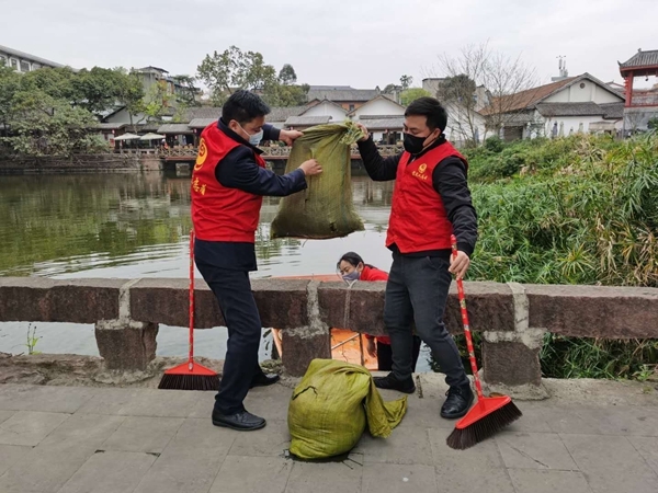 洛带古镇景区自2月20日有序开放以来,累计接待各方游客75000余人次。当天上午十点过,洛带镇100余党员自发来到五凤楼广场以及北街小巷,与环卫人工人一道清运垃圾、打扫卫生、打捞湿地杂草、开展文明劝导杜绝扔烟头、随地吐痰等。