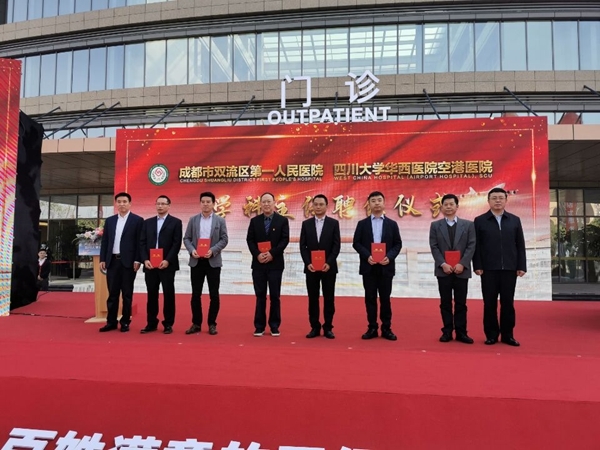 仪式上,“四川大学华西医院空港医院”揭牌,为华西医院派驻华西空港医院的6名学科主任颁发了聘任证书。