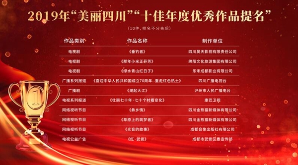 根据《“美丽四川”广播电视和网络视听精品创作工程评选办法》,从2019年3月起,四川省广播电视局与四川省互联网信息办公室联合在全省系统内开展了广播电视和网络视听优秀作品及制作机构评选活动。全省各市州广播电视行政部门、四川广播电视台、峨眉电影集团、四川教育电视台、省网络视听协会、网络视听制作机构、广播电视制作机构等单位积极参加此次评选活动,截止2019年年底,共收到全省报送电视剧21部、广播电视节目栏目141件、公益广告90件、网络视听节目912个和制作机构34家。经过层层评审,在充分征求专家意见和公示后,分别有20件作品和20家制作机构脱颖而出,成为“美丽四川”2019年度“十佳”与“十强”。这些优秀作品及制作机构大力弘扬社会主义核心价值观,坚持以四川视角,发掘四川故事,用川人和川景打动世界,诠释了新时代、新气象、新作为,充分展示巴蜀文化,为“美丽四川”增光添彩。