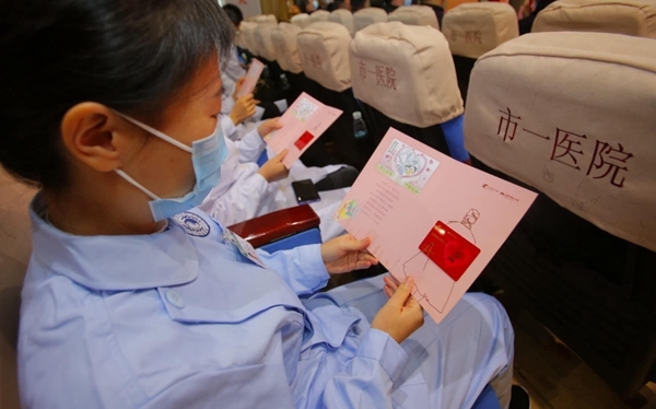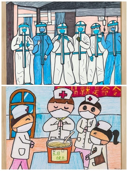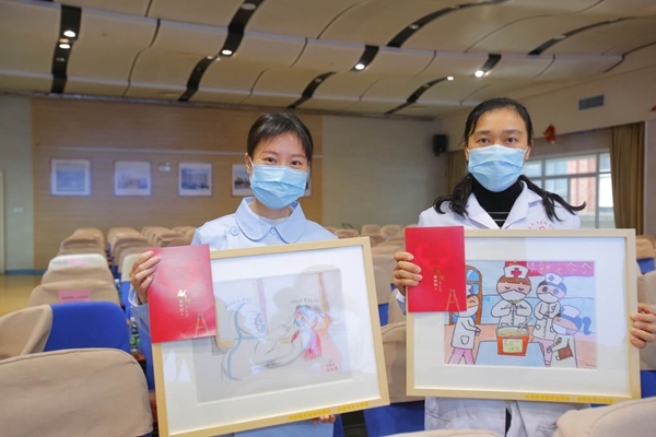 据介绍,医务人员援鄂期间,共青团成都市委、成都市青少年宫号召青少年围绕“战疫”进程中涌现的感人事迹进行艺术创作,以青少年视角、通过艺术化表达充分展现战胜疫情的信心和决心,通过书法、美术等形式致敬抗疫一线的英雄。这些由孩子亲手创作的礼物中,有的通过彩笔为“战疫”一线的最美逆行者点赞,庆祝医务工作者们凯旋归来,有的通过“天使豪气逆行路·众人齐心战瘟神”“医者仁心·不辱使命”等书法作品表达敬意。