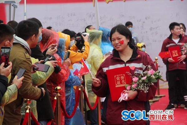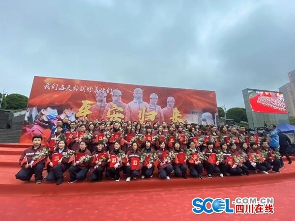 四川在线消息(记者 秦勇 文/图) 白衣执甲,逆行出征,英雄凯旋!4月3日,自贡援湖北医疗队79名队员,乘坐专车回到自贡,自贡在南湖体育中心北门广场举行隆重的欢迎仪式,欢迎英雄回家。
