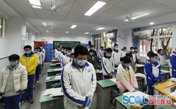 四川在线消息(记者 邓翔沣)4月4日上午,成都七中林荫校区高三年级教室内,讲台上的老师突然停下讲课,正在做摘抄的学生们也不约而同地放下笔,时针指向十点,全体师生起立,集体低头默哀。