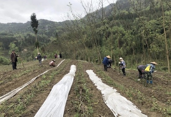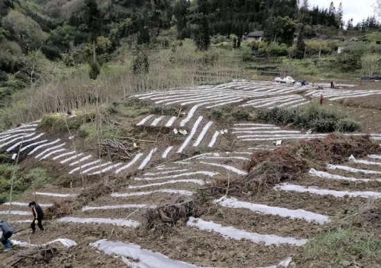 几场春雨过后,荥经县花滩镇大理村一期茶园里新苗吐绿。4月8日,田间地头,村民们正在忙着种植生姜。犁地、挖沟、种姜、覆土、铺膜,大家分工协作,有条不紊,一片繁忙景象。