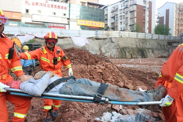 18时25分,物流港政府专职队到达现场,经侦查和询问现场知情人了解到,现场因土方松动坍塌导致1名施工人员被土方埋压、1人被砸伤困在工地上。且被困人员上方土质疏松,里面混杂着大量石块和建筑垃圾,随时有发生二次垮塌危险,情况十分危急。根据现场情况消防救援人员立即利用担架将受伤人员抬出送上救护车进行救治;另一组人员立即利用铁锹、铁铤、手刨等方式对被埋压人员进行施救。同时,警戒组对工地周边进行警戒禁止无关人员进入,并设立安全员随时观察救援现场上方情况防止二次垮塌造成人员伤亡。经过物流港政府专职队和花溪路消防救援站救援人员30余分钟的紧张救援,19时,被埋压人员被救出,并交由医护人员进行抢救。