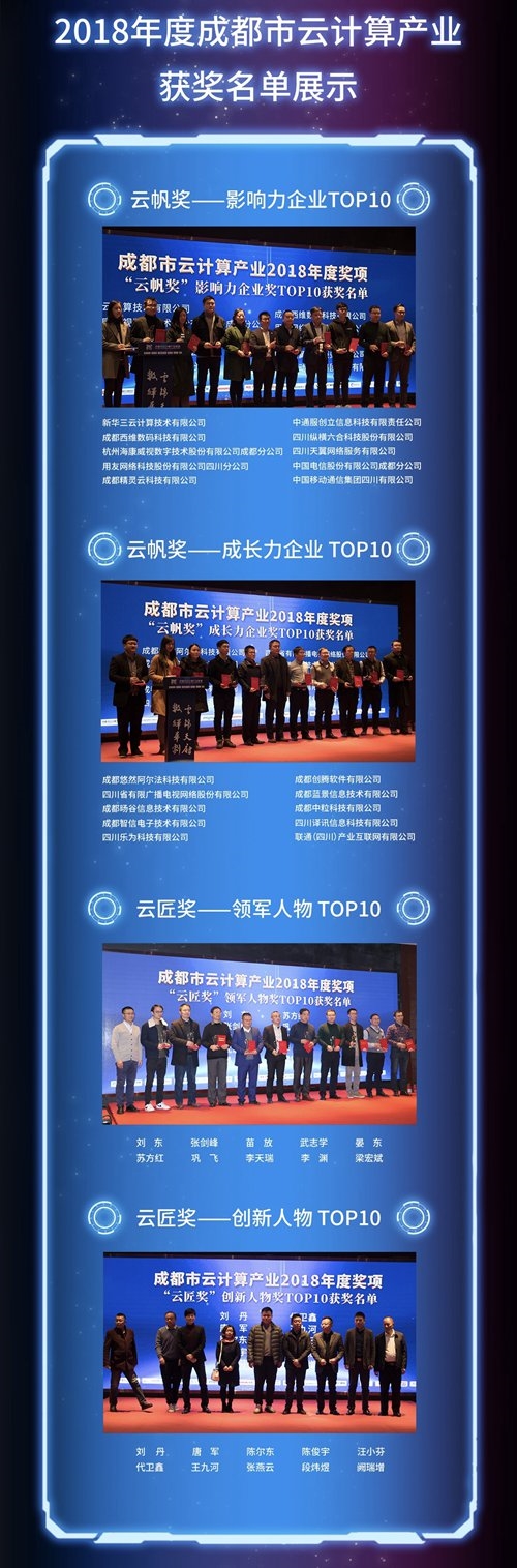 其中,蜀锦奖表彰2019年度大数据领域影响力企业、成长力企业,蜀绣奖表彰2019年度大数据领域影响力人物;云帆奖表彰2019年度云计算领域影响力企业、成长力企业,云匠奖表彰2019年度云计算领域影响力人物。