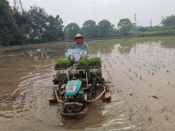 4月16日,泸县得胜镇得胜村,几个村民正在田块小的地里手工栽秧苗,在面积宽大的田块里,一台手扶式插秧机来回穿梭,所到之处,留下了一行行栽插整齐的秧苗。