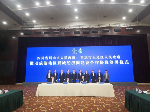 4月17日,眉山市与重庆市大足区在眉山市签订《推动成渝地区双城经济圈建设合作框架协议》和两个专项协议,双方就共同谋划铁路通道建设、促进文化交流融合、协同开展开放平台交流合作、协同推动电子信息产业合作等12个方面达成共识。