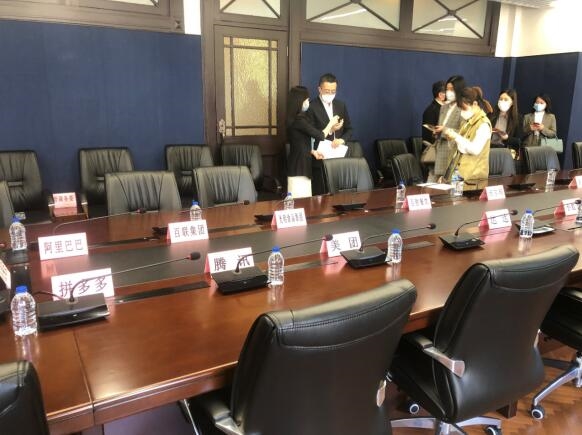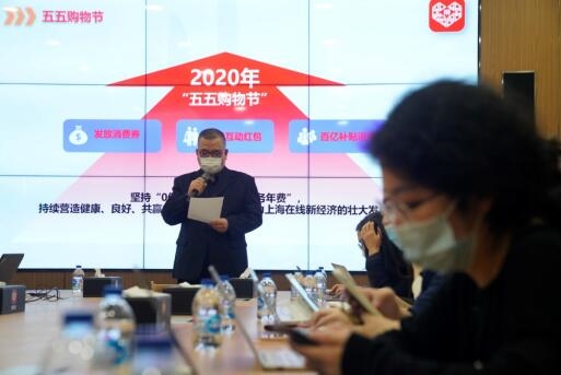 ▲4月23日下午,上海市商委召集拼多多、阿里巴巴、腾讯、美团等在沪互联网企业以及百联、光明等本地国企与媒体座谈“五五购物节”筹备情况。李胜 摄