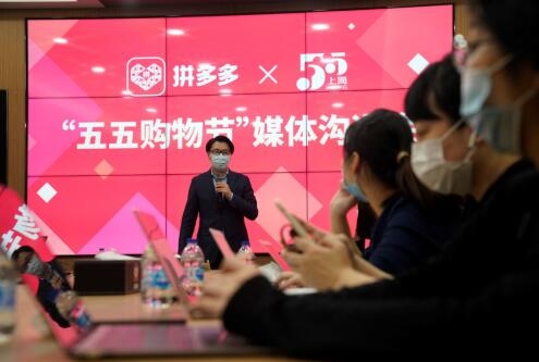 ▲4月23日,拼多多宣布,将投入15亿元现金及补贴,联合10000家上海品牌和企业,全力支持上海市“五五购物节”。拼多多高级副总裁王坚正在介绍平台助力“五五购物节”的具体举措。李胜 摄