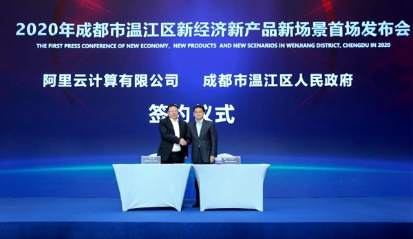 发布会主会场内,成都市温江区政府与阿里云就全面合作进行签约,将在数字产业开展合作,助力产业数字化升级,加快温江区数字化城市进程。温江区新经济和科技局副局长徐文斌推介新经济科创产业空间——数智创新中心,未来将形成新经济产业与三医产业双核驱动同频共振,实现温江经济高质量发展。