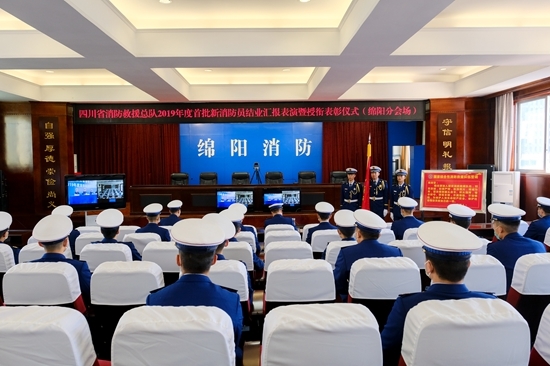 四川在线消息(张金记者钟帆)“我志愿加入国家消防救援队伍,对党忠诚,纪律严明,赴汤蹈火,竭诚为民......”4月27日上午,四川省消防救援总队举行2019年度首批新消防员入职培训结业汇报表演暨授衔表彰仪式,绵阳市消防救援支队在分会场同步举行新消防员授衔仪式。面向“中国消防救援队”队旗,新消防员们敬礼并庄严宣誓。