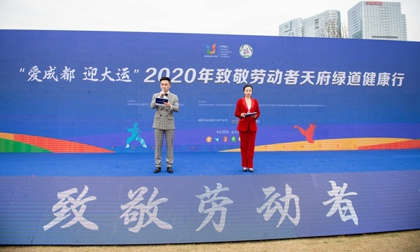 五一节即将来临。4月30日,由成都市体育局、成都市总工会、共青团成都市委、成都高新区管委会主办的“爱成都·迎大运”——“2020年致敬劳动者天府绿道健康行”活动今天在成都高新区交子公园绿道举行,近600名劳动者参与此次活动,感受来自这座城市致以他们的崇高敬意。