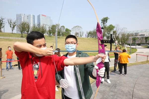 活动现场形式多样,既有武术、健身气功等传统体育项目展示,也有跆拳道、射箭等大运会比赛项目体验,还有亲子体育项目互动,个人竞技挑战项目打卡等活动,现场观众可凭自身爱好参与项目。“这么多年来我们都受到中国女排精神的鼓舞,但很少有机会打排球,气排球还比较简单,打起来手也不痛,特别安逸,我们非常喜欢。”黄大哥是一名环卫工人,平时很少参与体育运动,也借活动机会现场跟青年朋友学习太极拳。