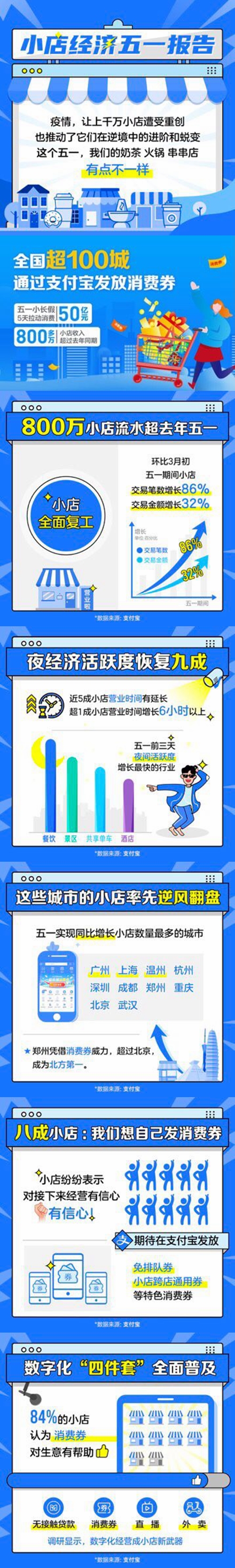 支付宝消费券进一步带动了小店夜经济的复苏。这个五一小长假,小店夜经济活跃度已恢复九成,热闹的宵夜摊又回来了。近五成的小店表示近期营业时间有大幅度延长,超过10%的小店营业时间延长六个小时以上。