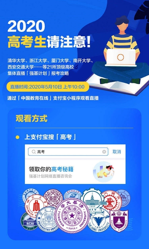 高校“自主招生”今年初正式被教育部取消,取而代之的是“强基计划”,目前仅在清华、北大等36所一流大学开展试点。新计划如何招生,对高考考生有何影响?5月10日(周日)10点,21所国内一流高校的招生办,将通过支付宝小程序向考生及家长直播讲解,其中包括四川大学、电子科技大学等西南高校。