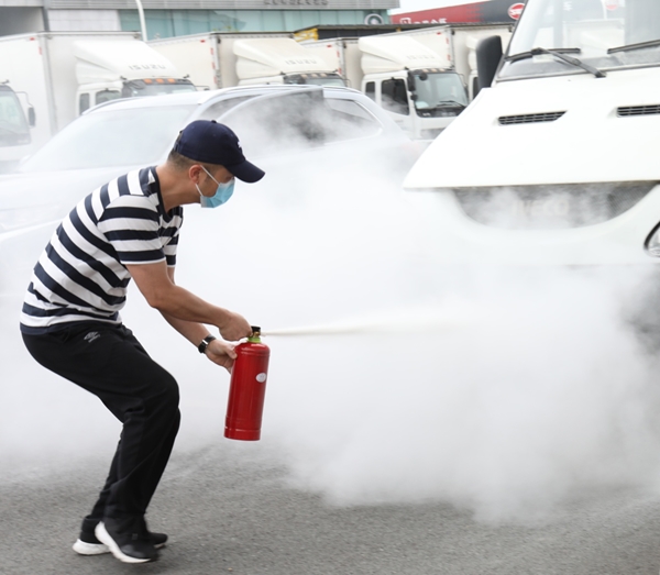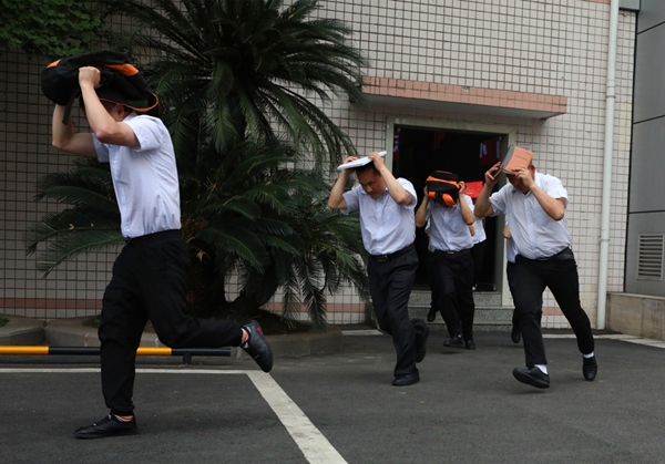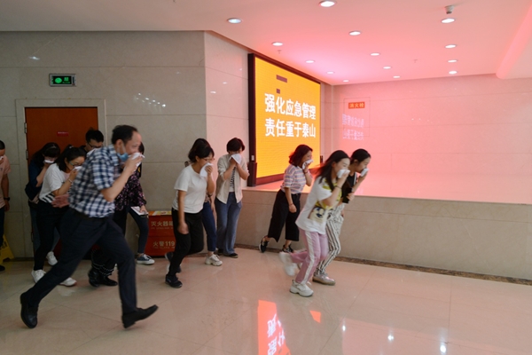 不仅在“食”和“行”上,这次演练还涉及“住”——“着火了,着火了,快拿灭火器!”5月9日下午2点30分,机关办公大楼11楼12313指挥中心“突发”电器短路起火,火势迅速扩大,现场办公人员立即发出火灾求救信号。“立即启动突发事故灾难应急预案!”2点36分,大楼浓烟四处蔓延,应急演练副总指挥在消防控制室了解情况后,当即做出启动预案的决定。消防疏散的广播响起,全体干部职工迅速手捂湿毛巾撤离到广场。2点50分,在短短20分钟内,火势得到有效控制,除开一名员工“灼伤”、一名员工疏散途中脚踝“扭伤”外,没有造成进一步“伤亡”。