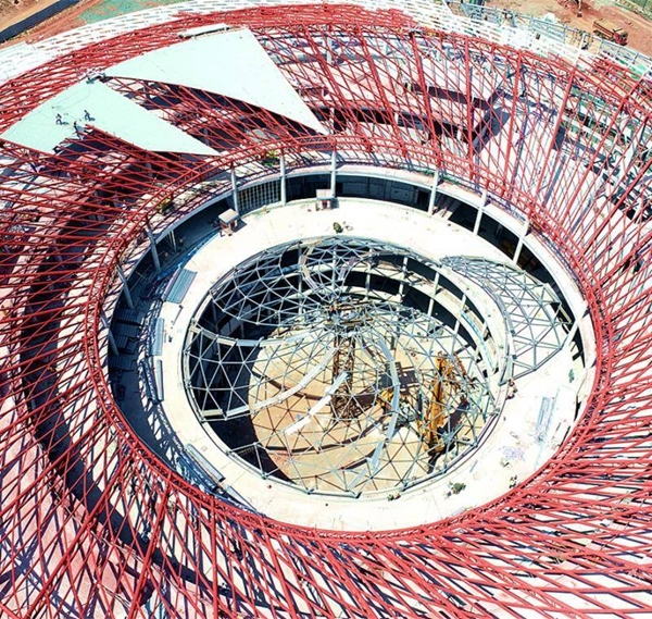 站在五福大道,遥望淮州新城国际会展中心,远远地就能看见,会展中心的顶部屋面檩条,大部分已经涂上了红色面漆。在会展中心内部,记者看到楼层内已经施工了大部分的砌体,还安装了部分粉色的隔墙。