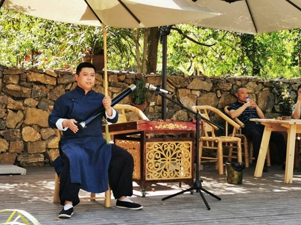 在蟠龙村文创聚落活动现场表演了四川清音《小放风筝》《布谷鸟儿咕咕叫》和四川扬琴、四川竹琴、四川金钱板等曲艺节目。