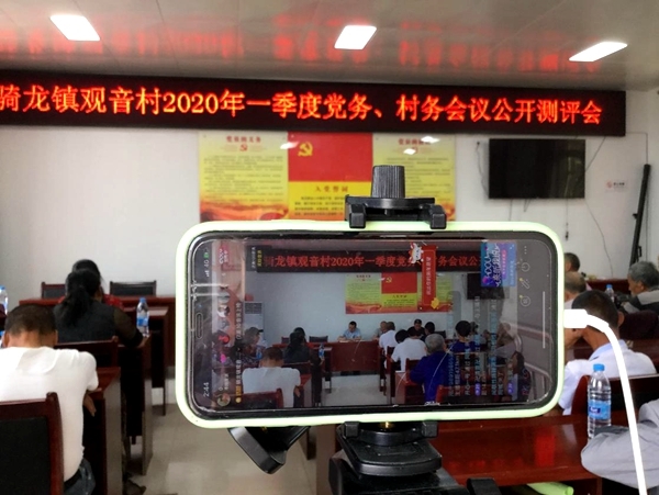近日,在富顺县骑龙镇观音村一季度党务村务公开会上,观音村支部书记兼村主任邱生明面对直播镜头现场述职,村副主任林明德一边展示资金支出的相关票据,一边向在场的30多名党员群众代表等作说明。与以往的村务公开不同,这次会议利用直播平台,向未到现场的村民进行了同步直播,让大家足不出户也能感受“面对面”交流。