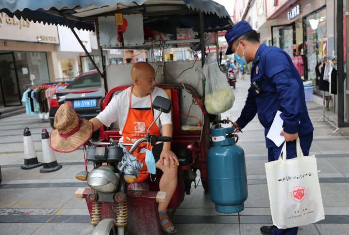 在天彭街道天一广场,消防人员对占道经营的水果摊贩进行了宣讲,强调了消防通道的重要性。火锅,是四川人爱吃的一道美食,尽管天气炎热,也丝毫不减好吃嘴的热情。在团结街一家火锅店,消防人员发现路边堆放了不少液化气罐,随即对工作人员进行了宣传教育,要求撤离堆放在路边的液化气罐,拿来灭火器讲解操作使用方法。