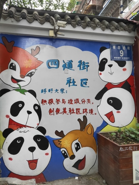 走过“封面”,进入了街区。不宽的小街,墙白路净院子整洁,街道两旁连续的院墙上,都是熊猫和“暖小四”在各个垃圾分类处理现场的画面,萌萌的,可爱又生动。