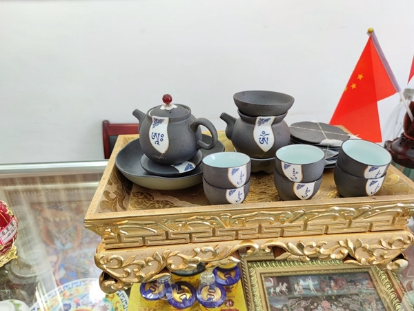 “在我们这里,民族团结不是说在嘴巴上的,而是做在杯子中的…..”6月13日下午4点,在甘孜州炉霍县城的霍尔广场,炉霍县华彩文化传播有限公司的销售人员王富全正指着柜台上一个黑白相间茶具给游客介绍,这是这家店里面的最新产品——“团结杯,一套由炉霍县的黑陶和景德镇的瓷器合起来烧制而成的茶具。
