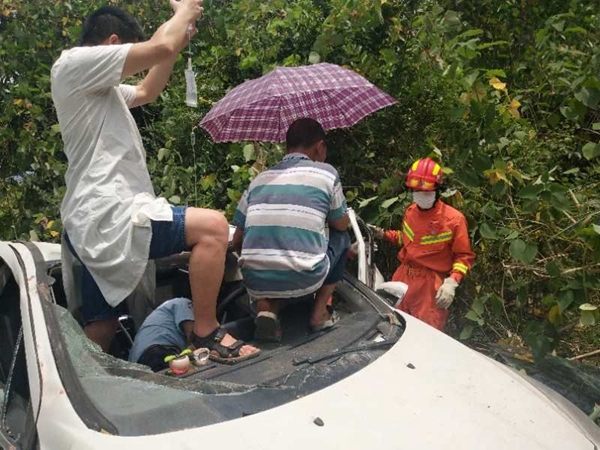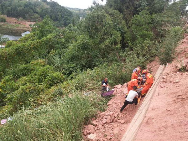 12时27分中队到达现场,经现场侦查发现一辆白色小轿车掉落在悬崖下,车子严重变形,驾驶员被困驾驶室,无法动弹。如果不及时营救将给被困人员带来严重后果。根据现场情况,中队立即组织营救,做好安全警戒,防止围观群众妨碍救援工作,将被困人员抬上多功能担架,同时派人与被困人员进行交流,一方面转移被困人员的注意力,另一方面确保被困人员意识清醒,以免因失血过多昏厥。随后,消防人员利用绳子将多功能担架拉上悬崖。