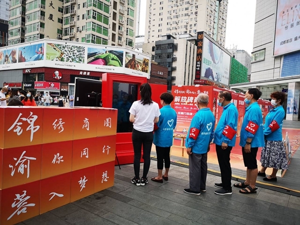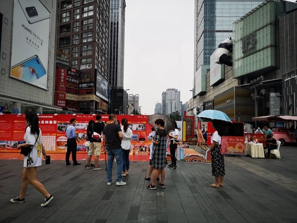四川在线消息(记者 钟帆 摄影报道)“重庆的朋友们,你们好,我们是‘春熙嬢嬢’!”6月15日下午,在行人如织的春熙路街头,通过“春熙商圈党建成果展”的双城任意门,“春熙嬢嬢”隔空喊话来往重庆解放碑的人们。除“任意门”外,此次党建成果展以图文方式展示了春熙路的历史变迁、文化传承和历史成就,吸引了不少行人驻足。该党建成果展也是成渝核心商圈党建联盟启动仪式的预热活动之一,从6月11日持续到18日。