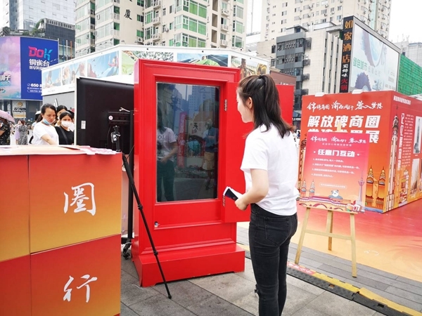 此次预热活动,在春熙路、解放碑同时进行。为增强活动的趣味性、互动性,在活动现场,还分别设立了两块电子显示屏的任意门。通过双城任意门,过往游客不仅可以观看锦江区、渝中区城区宣传片以及商圈重点企业的推介视频,还可以通过显示屏实时互动,实现两地街景的实时互联、商圈游客“隔空”喊话、商家企业在线交流推介。