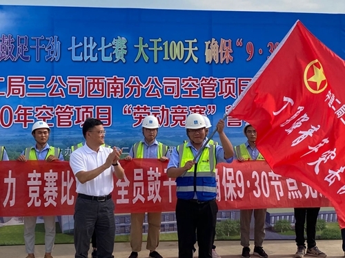 省总工会副主席彭闯宣布空管项目劳动竞赛正式启动,并为项目“丁勇强青年突击队”授旗。西南分公司工会副主席任晓宝宣读了本次劳动竞赛实施办法。丁勇强青年突击队作为空管项目一支年轻的突击队、主力军,将紧紧围绕本次劳动竞赛“精心组织鼓足干劲七比七赛大干100天力保9·30节点”的主题,坚持目标、主动担当,履职尽责、甘于奉献,充分发挥青年突击队的顽强拼搏精神和开拓创新精神,带领项目全体一线职工团结协作,顽强拼搏,甘当空管项目“贡献石”,围绕各项目标任务,保质、保量、保安、保期的实现“9·30”节点目标建功立业。