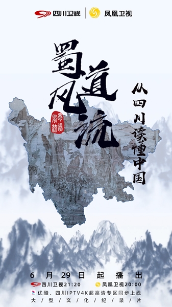《蜀道风流》共10集,将于6月29日起,每晚21点20分在四川卫视播出、每晚20点在凤凰卫视播出,优酷、四川IPTV 4K超高清专区同步上线。该片每集篇名均以诗句构成,“尔来四万八千岁”“天生襟度容江海”“不可居无竹”等,从不同侧面彰显四川文化中的浪漫气息和历史厚度。
