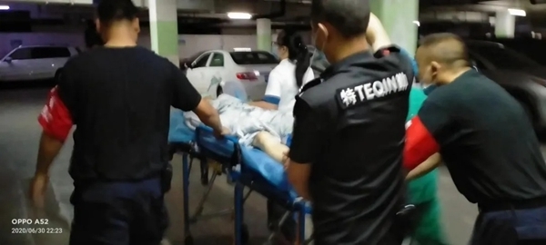 22:09分,救护车赶到了现场。胡贤春由于长时间胸外按压+人工呼吸,此时已经累得手臂几乎无法抬起,但依然坚持合力将患者抬上救护车,交由专业医护人士处理。