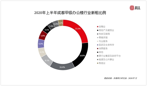 房地产建筑业办公需求回暖。报告指出,随着东部新区设立,成都城市版图扩容,新区开发带动城市化提速,基建与房地产投资必将随之而来。房地产建筑业的办公需求上半年上升明显,新租占比达18.8%,较2019年高出5.1个百分点。