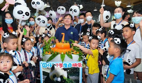 四川在线消息(记者 邓童童)7年前的今天,赠台大熊猫“团团”“圆圆”产下首只幼仔,取名“圆仔”。时光荏苒,当年稚气可爱的小女熊已出落成婷婷玉立的美少女,7月6日,“圆仔”7岁云生日现场,通过大屏幕看到她美滋滋享受生日蛋糕的画面,中国大熊猫保护研究中心大熊猫饲养师们又激动又欣慰。