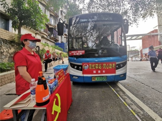 车内开放空调,设有流动书吧,还备有应急文具、应急药品、爱心雨伞等物资。“给家长们提供一个侯考休息点,也力所能及地给予考生们帮助。”攀枝花市公交公司相关负责人介绍,为助力疫情防控下的这场高考,攀枝花市公交公司、公交客运派出所、交警二大队、仁和交警大队联合开展本次志愿服务,分别在东区市三中考点、仁和区大河中学考点设置了2台纯电动社区巴士作为“彩虹驿站·同心助考”驿站。