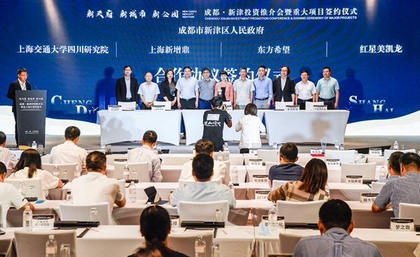 发展机遇与特色本底叠加,吸引了众多项目落地。当天,多家企业、高校分别与新津达成合作,总投资达45亿元。
