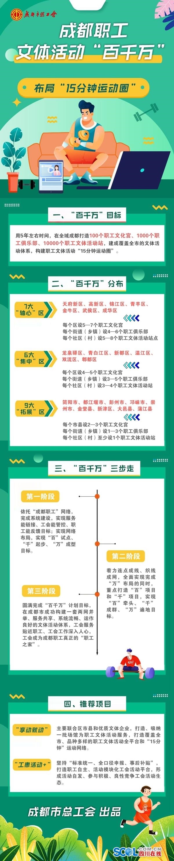 “100个职工文化宫,1000个职工俱乐部,10000个职工文体活动站。”成都市总工会相关负责人介绍,文体活动“百千万”计划用5年左右时间建成覆盖全市的职工文体活动体系。