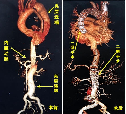 为了保障患者的治疗安全,决定将手术分为两次进行。一期手术在去年8月22日顺利完成,通过植入主动脉的覆膜支架来帮助近端的血管破口“堵漏”。为避免黄爷爷在术后发生截瘫,团队为其制定了一个恢复周期,二期手术被安排于今年6月进行。