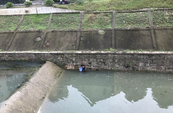 从绿化带到达河道还有十余米长的陡斜坡,斜坡上全是雨后稀泥、青苔,脚搭上去人就打滑,稍有不慎也会顺势滑下掉进河里。民警们一个牵一个手拉成一路,躬身慢慢下行走到堤坎上。